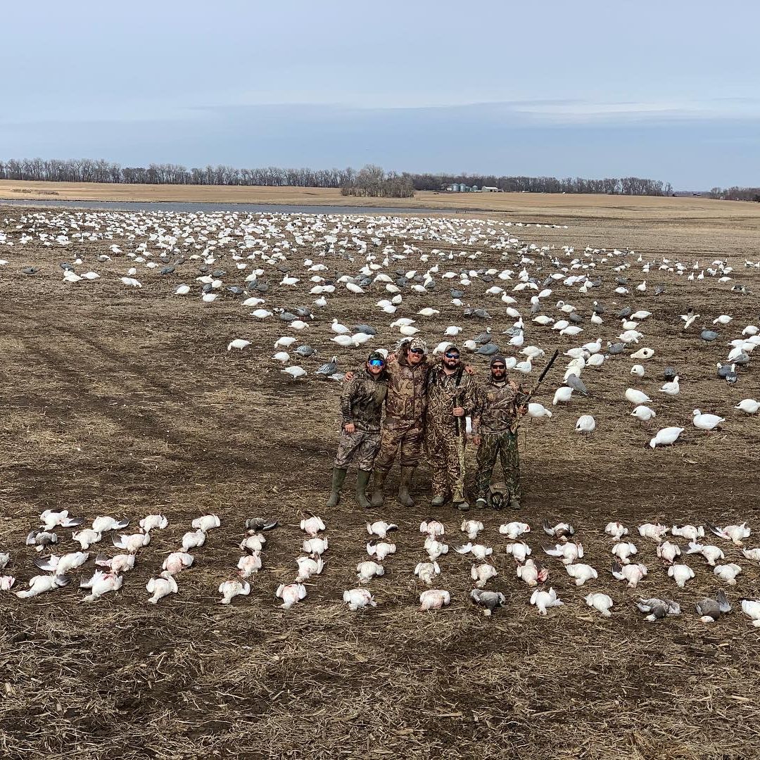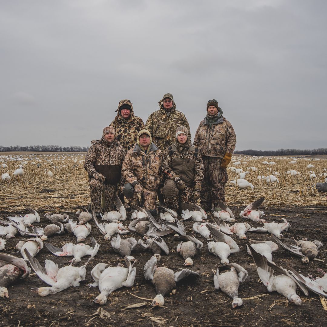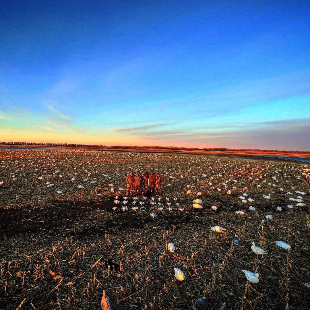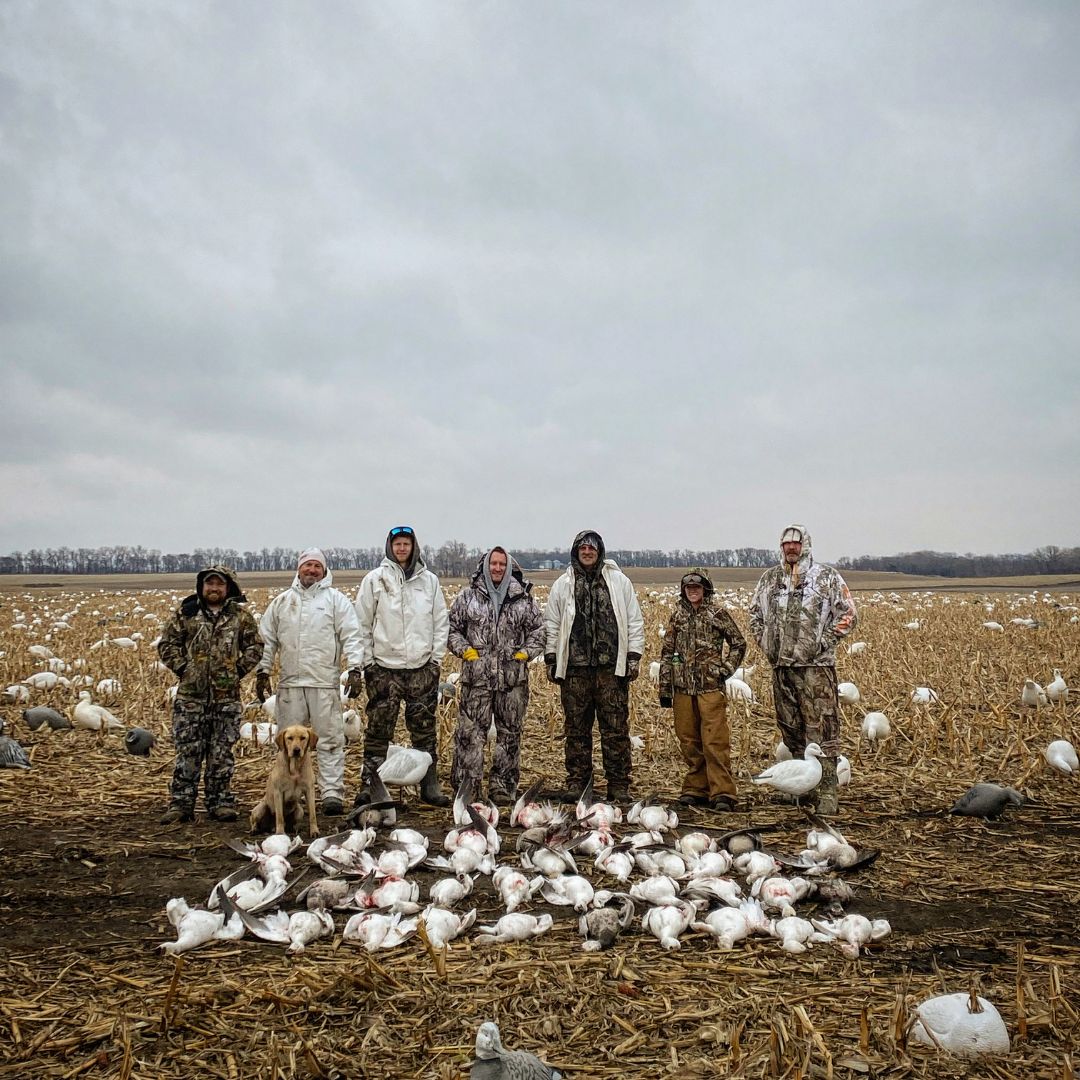 Snow goose hunts are located in Henry, SD. We offer a 10,000 sq ft lodge to our guests on these hunts. The hunt takes place in a heated pit over a massive decoy spread in the rolling hills of South Dakota. There are no limits on snow geese during this spring season. There are also no plugs required during this season. All hunts take place between March 10th and April 10th.