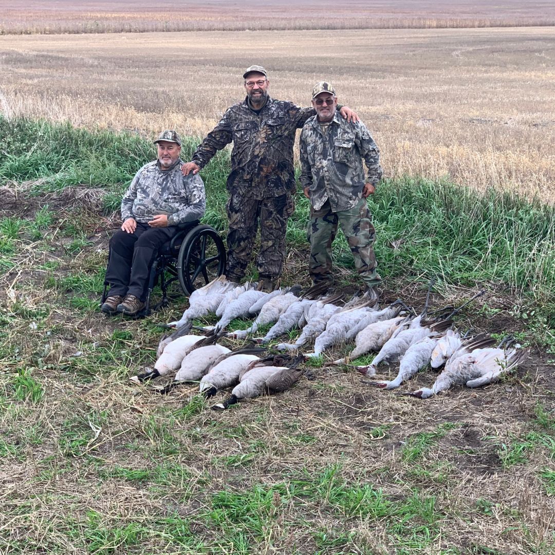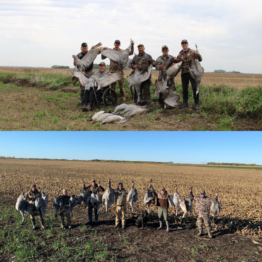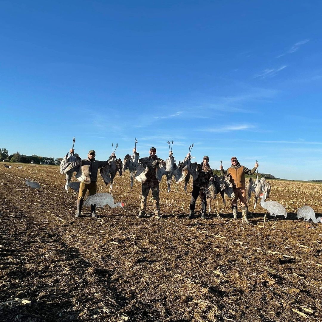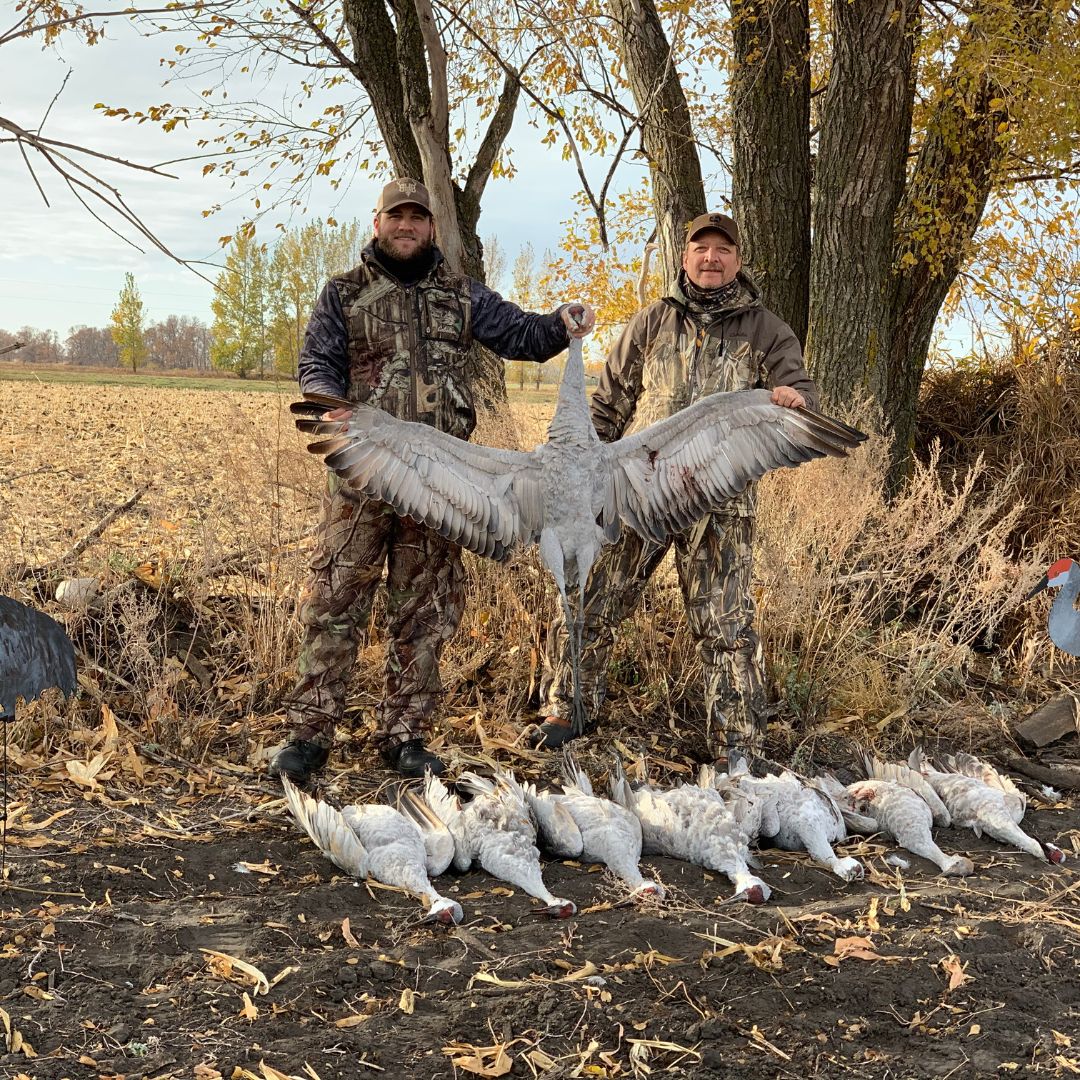 All sandhill crane hunts are in NW Minnesota. The hunt takes place out of an A-frame blind or ground blinds. You will be hunting over a full-body sandhill crane decoy spread. It is a very flat landscape where we hunt in NW Minnesota. There is a limit on these birds which is susceptible to change. Currently, you can shoot 2 cranes per day with a possession limit of of 6. Bird cleaning services are included with the cost of your hunt. Hunts take place between September and October each year.